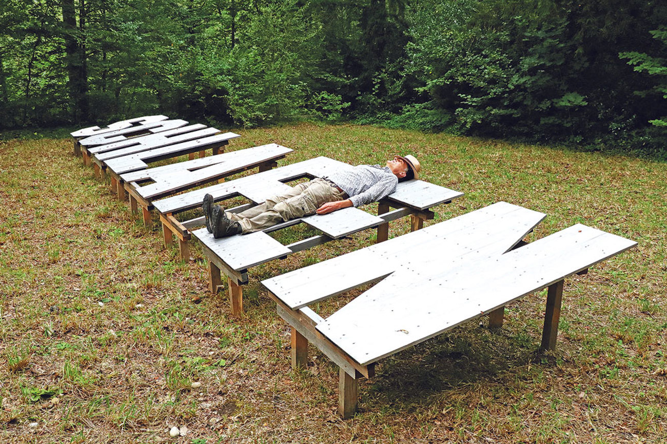 Auf einer Lichtung bilden liegende Buchstaben das Wort SCHLAFEN. Ein kleines Schild lädt zum «Probeliegen» ein. Der Perspektiventausch ist eindrücklich. Auf dem Friedhof zu liegen und in den Himmel zu schauen, beschert gemischte Gefühle, die sich auf den Gesichtern der Probeliegenden spiegeln. Der Trompeter Beat Bossart begleitet die Szene mit dem russischen Wiegenlied «Bajuschki Baju».