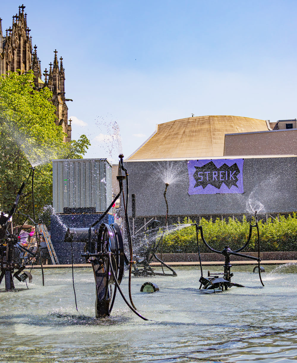 Irdisch erquickend sind die berühmten Tinguely-Brunnen: Vier stehen allein im öffentlichen Raum. Denjenigen in Fribourg widmet er dem Formel-1-Fahrer Jo Siffert, den vor dem Basler Theater dessen Vorgängerbau. Der Fasnachtsbrunnen mit den sisyphushaft agierenden eisenharten Protagonisten steht dort, wo einst die Bühne des Theaters war. Es ist überdeutlich: Tinguely war gegen den Abriss.