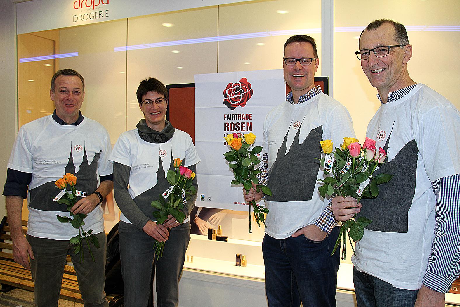 Ein emsiges Kommen und Gehen herrschte am Samstagvormittag im Glärnisch-Center in Glarus. Mittendrin der Stand der reformierten Kirchgemeinde Glarus-Riedern und der katholischen Pfarrei St. Fridolin: Jugendliche, Pfarrpersonen, Kirchenratsmitglieder und Politiker verkauften Max-Havelaar-zertifizierte Rosen zu einem symbolischen Preis von fünf Franken pro Stück.