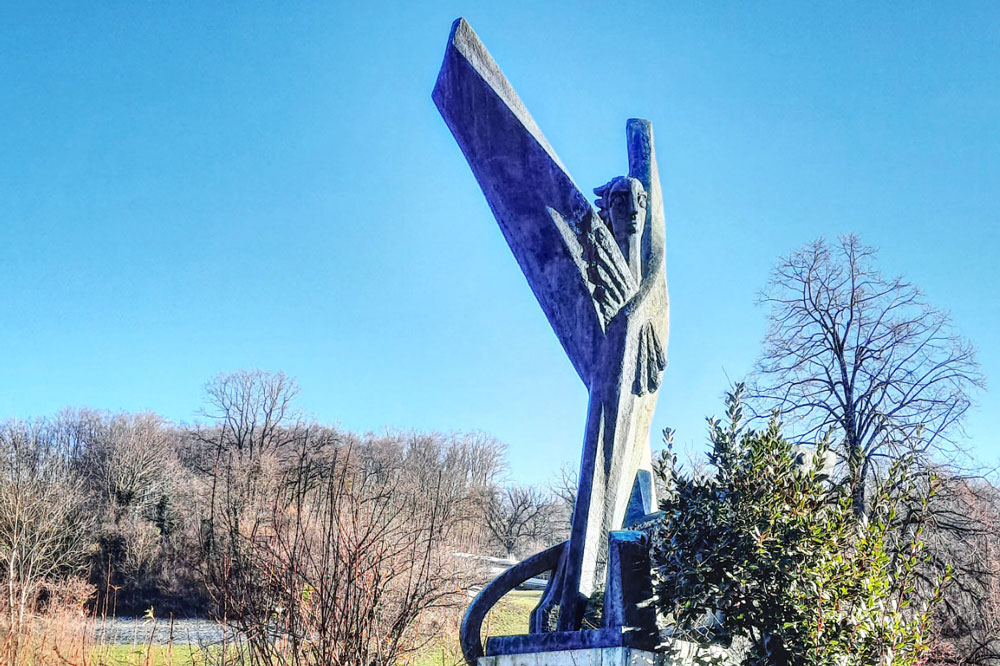 Eine anthroposophisch gestaltete Engelsstatue im Garten des Goetheanums in Dornach. | Foto: Hans Herrmann