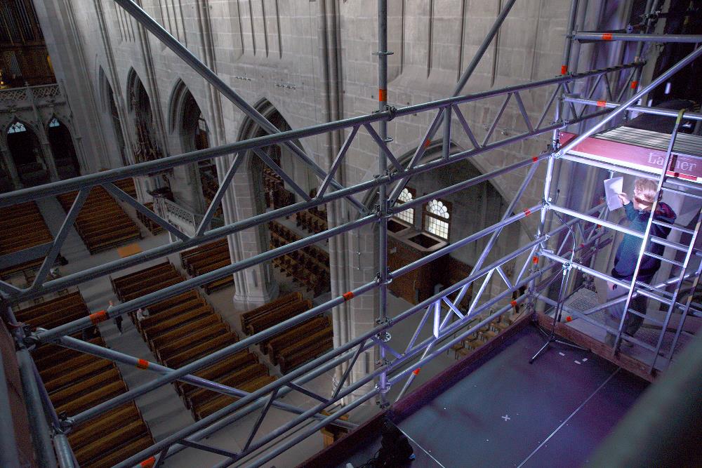 Es ist kühl im Münster und etwas düster. Das Herbstlicht kämpft sich tapfer durch die Kirchenfenster und erhellt nur schwach den Chor, vor dem ein riesiges Baugerüst aufgestellt ist. Von Wand zu Wand und bis weit hinauf zur Decke reichen die Eisenstangen. Seit Monaten werden hier Renovationsarbeiten ausgeführt. Marianne Oertel steht im Mittelgang und blickt nach oben zu Stefan Schönholzer, einem der Schauspielstudierenden, der in schwindelerregender Höhe auf dem Gerüst steht und liest. Oertel ist Sprechdozentin an der Hochschule der Künste HKB und eine der Mitinitiantinnen der Non-Stop-Bibellesung, die als Koproduktion mit dem Berner Münster stattfindet.