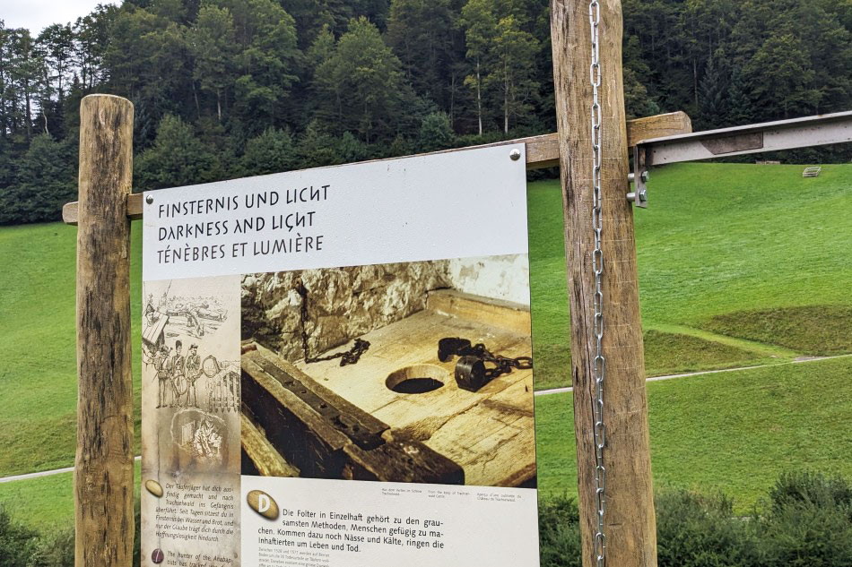 Mit Blick auf den Friedhof wird es dann wirklich «gfürchig». Auf einem Trio von Tafeln nebeneinander entfaltet sich vor grünen Wiesen und Wald ins Tal des Sältebach ein anders Bild. Mit «Glaube und Verstehen», «Finsternis und Licht» und «Glauben und Leben» wird einem das alltägliche Leben und Schicksal, das viele Gläubige der Täufergemeinde erleiden mussten, kurz und doch drastisch erzählt. «Der Täuferjäger hat dich ausfindig gemacht und nach Trachselwald ins Gefängnis gebracht», heisst es unter anderem. Da ist langes Sitzen in Einzelhaft und Finsternis, bei Wasser und Brot angesagt.