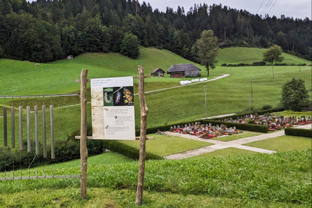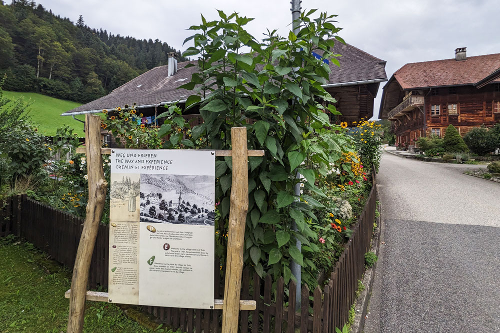 Mit etwas über einem Kilometer Gesamtlänge ist die Schlaufe, die nur wenig aus dem und übers Dorf führt, selbst für Wandermuffel keine Sache. Praktisch wäre noch, wenn der Weg unterwegs richtungsweisende Signale hätte. Die Stationen sind nur entweder durch Zufall oder mit dem Plan auf dem Flyer zu finden. Aber das Ende beim Anfang des Weges kann praktisch über alles trösten: Mit «bhüet di Gott» wird man verabschiedet.