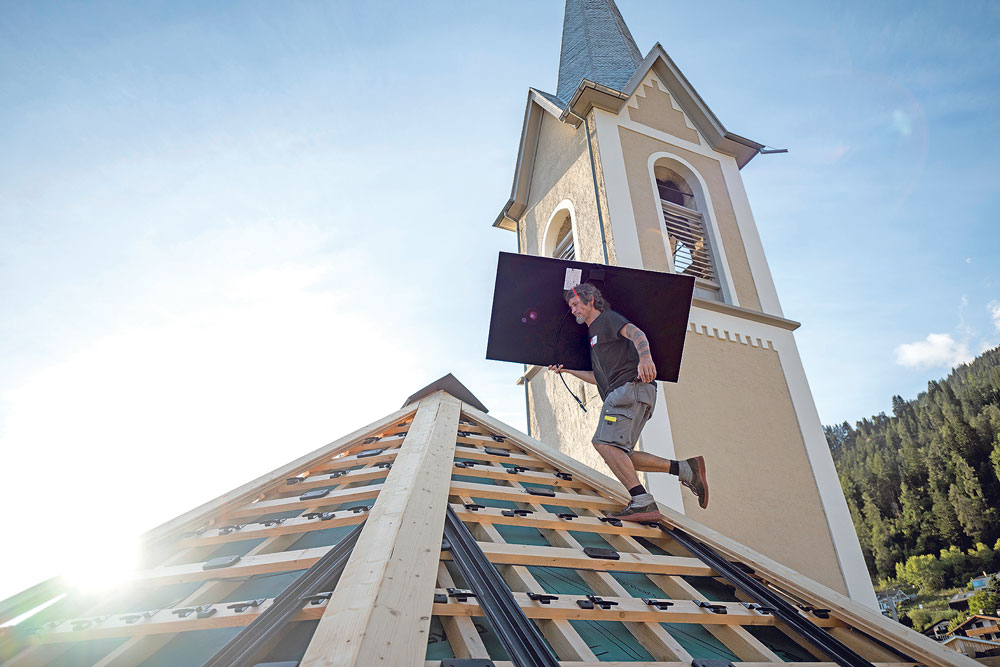 Kirche als Kraftwerk: Mittlerweile haben etliche Kirchen in der Schweiz auf ihren Dächern Solaranlagen installiert. Die ÂKirche ist nicht nur spiritueller, sondern elektrischer Kraftort. Die ĂĽber 500 Jahre alte reformierte Kirche im bĂĽndnerischen Trin dĂĽrfte die erste historische Kirche in der Schweiz sein mit einem Solardach.