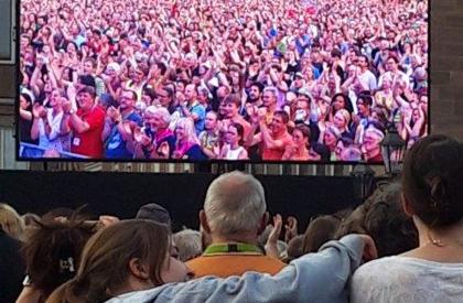 Dort stehen schon ziemlich viele Leute in der Schlange. Sie wollen zum Konzert von Bodo Wartke, das allerdings erst in zweieinhalb Stunden beginnt. Das wollen Marit und ich auch – ebenso die Thurgauer Pfarrerin Caren Algner, die auch auf dem Kirchentag ist und mich ansimst! Als Präsidiums- und Organisationsleitungsmitglieder dürfen wir uns etwas später anstellen und erhalten doch noch Sitzplätze. Wir schleusen Caren mit hinein – und was dann folgt, ist ein Konzert der musikalischen und sprachlichen Spitzenklasse. Die Halle ist mit 5000 Leuten voll besetzt, und der Applaus dröhnt auch in den Ohren. Zum Schluss schwenken wir das Handy-Pendant der Feuerzeuge, und ich hab mal wieder eine Rührungskröte im Hals…