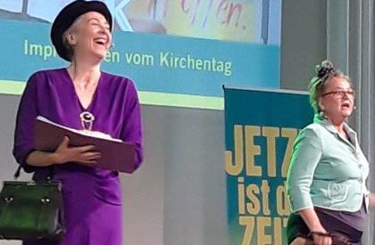 Dann fahre ich zum Zentrum Jugend. Dort darf ich die Bibelarbeit von Adele Seibold und Klara Sinn einführen, die Figuren der Theologinnen-Clowninnen Gisela Matthiae und Susanne B. Wolf. Die LUX-Kirche ist über den letzten Platz hinaus besetzt, wir entdecken zusammen Glühwürmchen des Reiches Gottes und warten auf den Blitz, der uns die Augen öffnet.