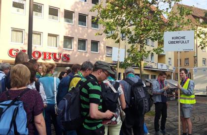 Kirchentag in Nürnberg! Am Bahnhof schon freundliche Helferinnen und Helfer, die den Weg erklären und Fragen beantworten. Vor dem Kirchentagsbüro die ersten Schlangen von Menschen, die ein Programm und ein Liederheft möchten – oder sich soeben entschlossen haben, eine Tageskarte zu kaufen.