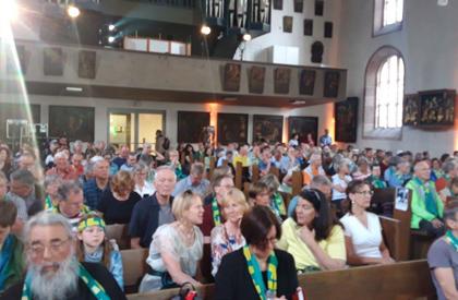 Dann wieder los, um halb zwei soll ich beim Verband Christlicher Pfadfinder ein Grusswort des Präsidiums zum 50-Jahr-Jubiläum überbringen. Die Reformationsgedächtniskirche ist voll besetzt. Alte und junge Pfadfinder und Pfadfinderinnen, alle in ihren charakteristischen Hemden und Aufnäher, hören Müsterlis aus der Geschichte und Gegenwart ihrer Bewegung und feiern dann im Gemeindehaus eine beträchtliche Anzahl von Pfadis, die schon seit 50 Jahren beim VCP dabei sind. Dazu spielt eine supercoole Band maritime Songs, was von Kirsten Fehrs, der Bischöfin aus Hamburg, auch fröhlich zur Kenntnis genommen wird.