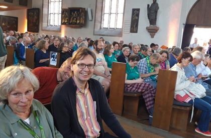 Dann muss ich wieder los, zu einer wunderbaren Bibelarbeit von Lukas Amstutz, dem Leiter des mennonitischen Bildungszentrums Bienenberg, den ich begrüssen darf. Er legt die Geschichte der Versöhnung von Josef und seinen Brüdern (1. Mose 50, 15-21) so aus, dass sie durchsichtig wird auf individuelle und politische Konfliktgeschichten. Auch auf seine eigene Täufergeschichte mit der verfassten Kirche. Prophetic Preaching im allerbesten Sinne. Die St. Jakobskirche ist denn auch wieder bis auf den letzten Platz besetzt – und nicht nur mir sitzt beim letzten Lied ein Frosch des zutiefst Berührtseins im Hals. Und ich bin stolz, dass ich ihn für den Kirchentag vorgeschlagen habe.
