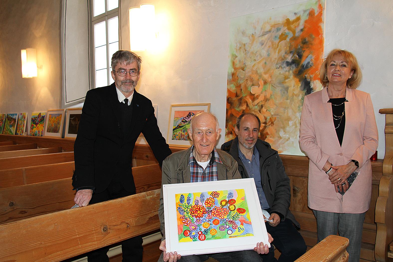 Der Pfarrer stellt This Baumgartner, den 79-jährigen Hobbymaler aus Engi, vor. Seit Anfang Februar lebt dieser im Altersheim Elm und hat dort bereits wieder drei Bilder gemalt. «This hat eine enorme Schaffenskraft», so Beat Wüthrich. Seine farbenfrohen Bilder in ganz unterschiedlichen Stilen und Techniken liessen ein alt bekanntes Gelände plötzlich in ganz neuen Farben aufleuchten: «Wie wenn es frisch renoviert wäre.»