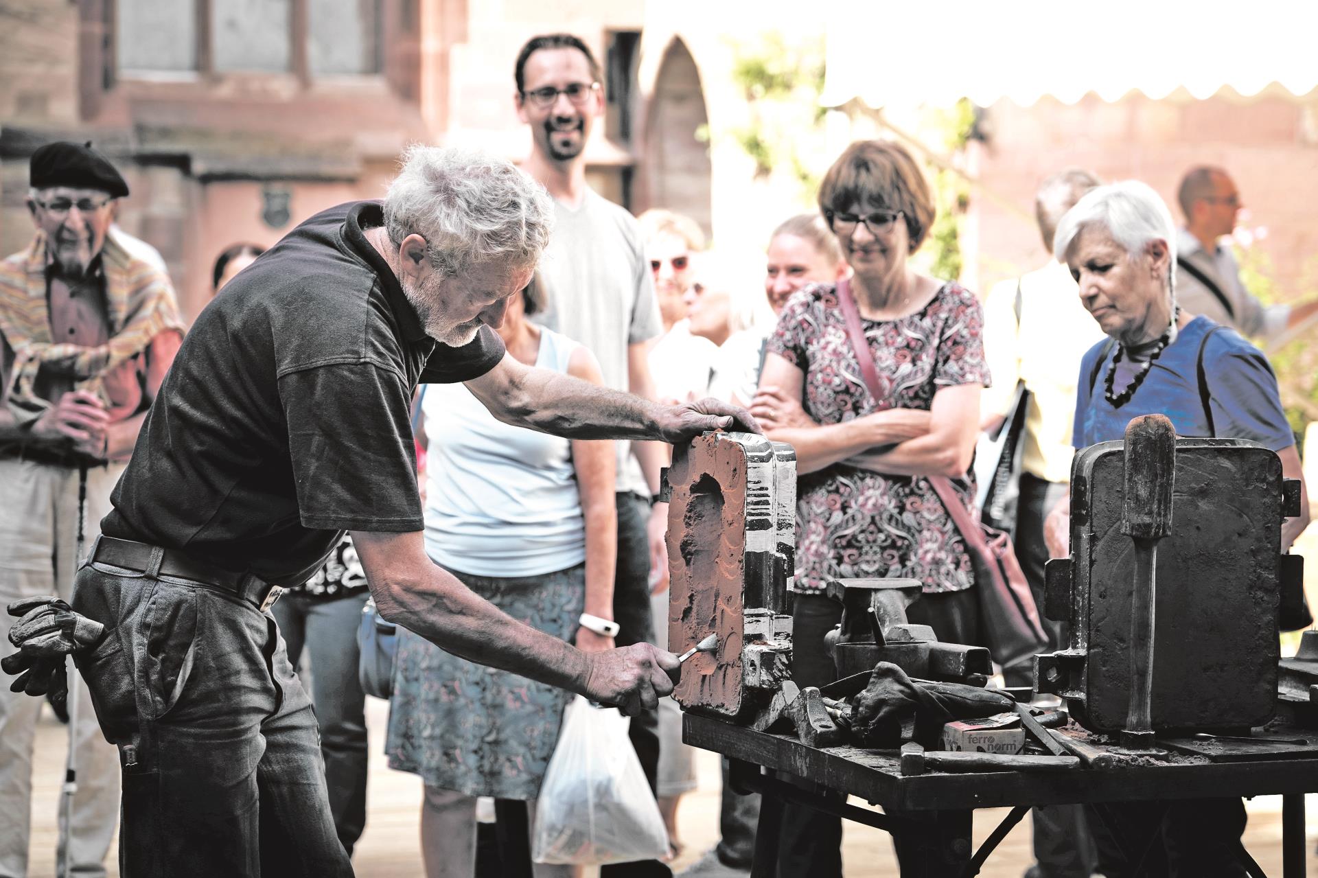Mitte September luden die Stiftung Basler Münsterbauhütte und deren Förderverein Freunde der Basler Münsterbauhütte zum Handwerkermarkt im Kreuzgang des Münsters. An rund zwanzig Stationen zeigten Handwerker ihre traditionelle Kunst. Die Besucher erhielten Einblick in die Berufsgattungen, die es braucht, um ein Bauwerk wie das Münster zu erschaffen. Sie konnten neben den Glockengiessern auch den Baumeistern, Steinmetzen, Zimmerleuten, Schlossern, Glasern, Seilern, Spenglern, Sattlern, Drechslern, Handzieglern, Papiermachern, Münzprägern sowie den Gold- und Silberschmieden über die Schulter schauen. Führungen und Filmberichte aus der Arbeit der Münsterbauhütte ergänzten das Informationsangebot. Wer wollte, konnte sich auch in der Kunst des Steinhauens versuchen.