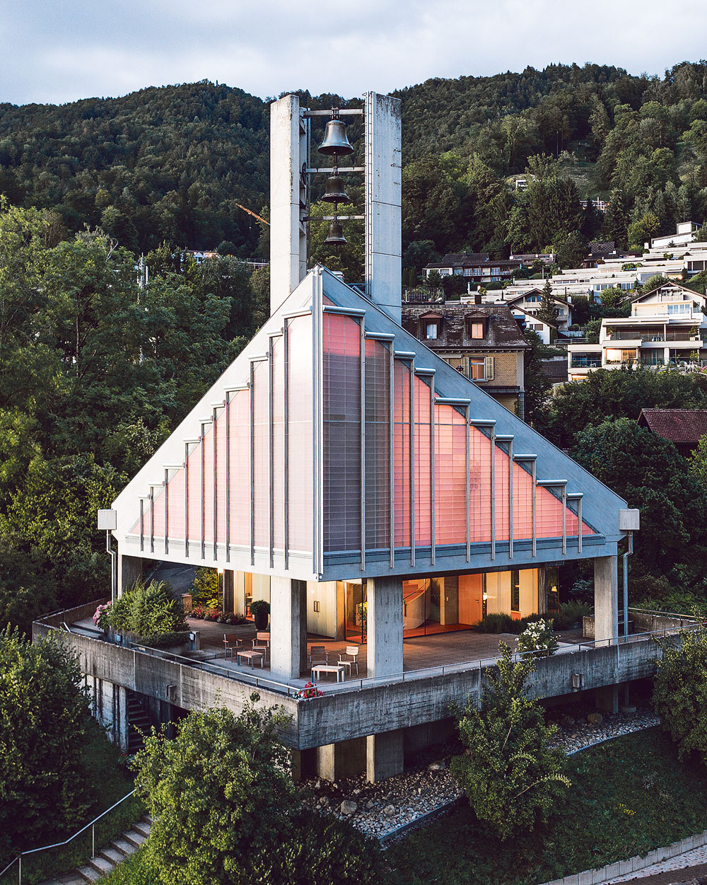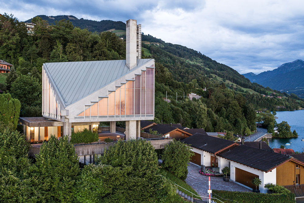 Wie ein kantiges Zelt erhebt sich der eigenwillige Betonbau mit dem kecken Glockenturm über einem Felsvorsprung am Zugersee. Konzeption und Konstruktion waren den speziellen, nicht einfachen Rahmenbedingungen geschuldet. Die für die Kirche auf dem Geländevorsprung reservierte Parzelle umfasst nur rund 1000 Quadratmeter, und in Respektierung aller Strassen- und Wegrechten verblieb noch ein 676 Quadratmeter grosser Baugrund.