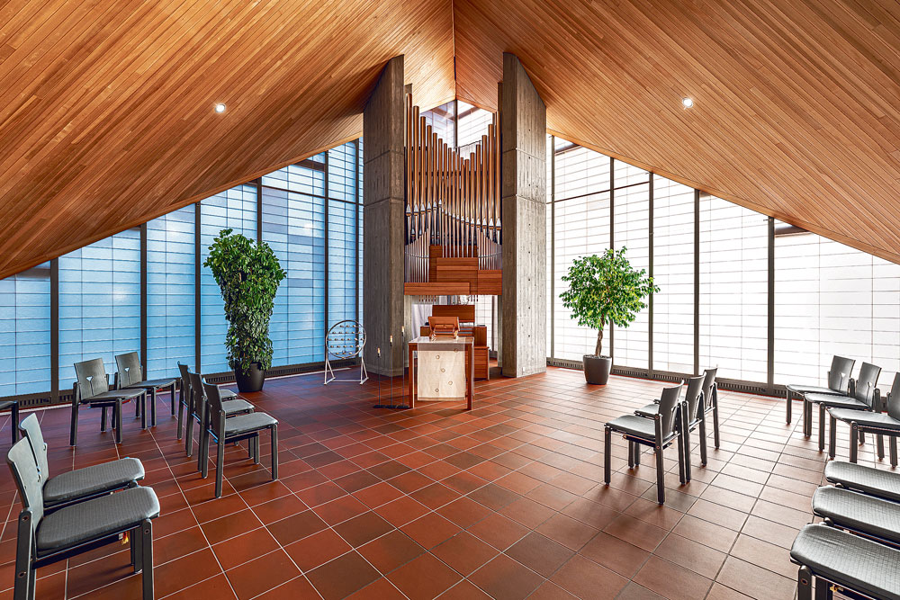 Ort der Kontemplation: Der Gottesdienstraum ist ausgestattet mit reduzierten Materialien ohne jeglichen Schmuck. | Foto: Regine Giesecke