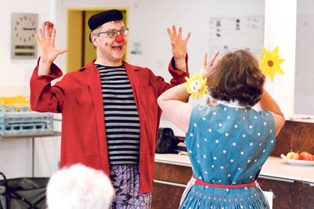 Im zweiten Stock warten schon vierzig Betagte. Einige sind noch rüstig und klatschen laut mit, andere sitzen im Rollstuhl. Die beiden Kontaktclowns öffnen ihren grossen Koffer, den sie für ihre Reise ins Tessin packen. Natürlich stellen sie sich ungeschickt an und geraten sich in die Haare. Als sie das Lied «Det äne am Bärgli, det staht en wissi Geiss» anstimmen, singen die Seniorinnen und Senioren begeistert mit.