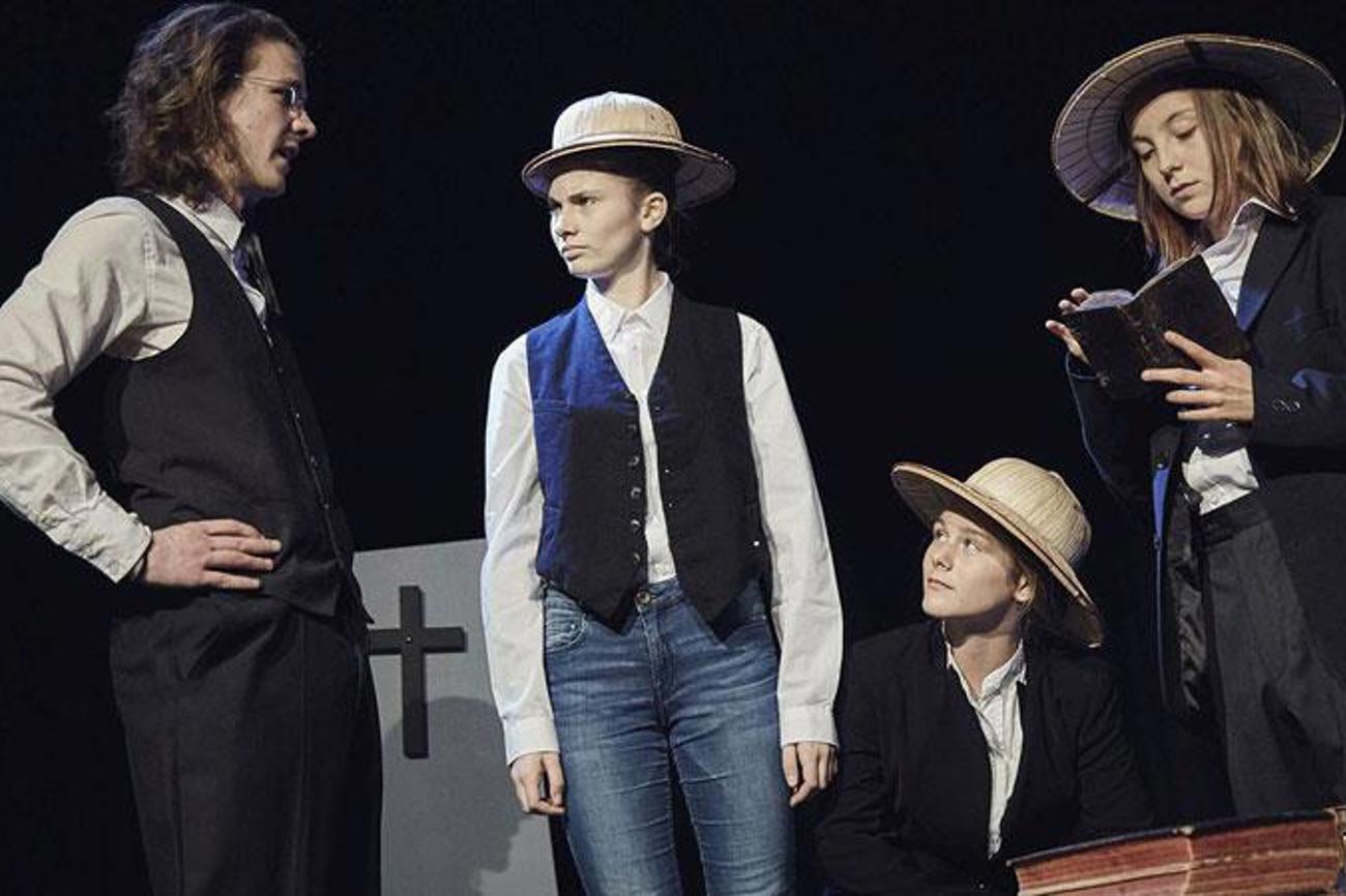 Nach und nach nahm die Idee Gestalt an. Ein vierköpfiges Autorenteam aus Mitgliedern des Ensembles machte sich an eine erste Fassung. «Lied einer neuen Welt» sollte das Mundartstück heissen, das selbstironisch die Erfahrungen des Ensembles aufgreift. Es schildert die Proben einer jungen Theatergruppe, die ein Stück zum Reformationsjubiläum aufführen soll. Mit Texten aus der Bergpredigt will sie den kirchlichen Alltag kritisch hinterfragen. Doch die Schauspieler werden gestört, als die Kirchenvertreterin Frau Kilchenmann in Begleitung des PR-Experten Meierhans auftaucht. Mit der Bergpredigt kann dieser wenig anfangen. «Es chircheferns Publikum versteit dä Täxt hüt nüm», interveniert Meierhans. Was die Kirche brauche, seien Identifikationsfiguren, schärft der PR-Mann den jungen Schauspielern ein und schafft drei Denkmalsockel auf die Bühne, auf denen Luther, Franz von Assisi und Dietrich Bonhoeffer fürs Publikum posieren sollen. Doch diese sind es leid, als Heilige verklärt zu werden. Sie steigen von den Sockeln und mischen sich in die Diskussion auf der Bühne.