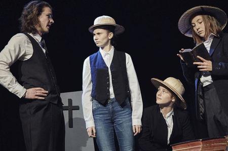 Im Stück wird dieser Mut zur Utopie noch von einer weiteren historischen Figur verkörpert: Der französische Pastor André Trocmé rettete während der nationalsozialistischen Besatzungszeit zusammen mit seiner Gemeinde fast 5‘000 Flüchtlinge vor dem Tod. An seinem Tisch findet die Theatertruppe gegen Ende des Stücks ein Beispiel für gelebte Menschlichkeit. Und für eine mutige Kirche. Ecclesia semper reformanda – so könnte sie aussehen. Doch die Versammlung in Trocmés Stube wird gestört von schwarzen Gestalten mit den Masken populistischer Politiker. Auf einer Leinwand erscheinen Fluchtszenen, Geschichte und Gegenwart fallen plötzlich zusammen, die Populisten bilden um die ankommenden Flüchtlinge eine Mauer, und die Utopie erweist sich einmal mehr als ein zerbrechliches Gut.