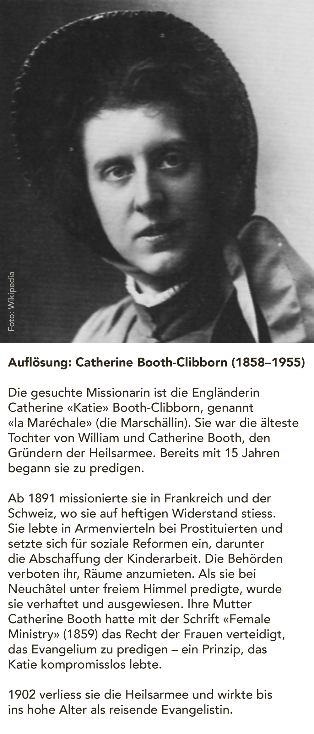 Sie war Offizierin, bekannt als «la maré-chale». Trotz ihres militärischen Rangs verkündete die junge Engländerin in der Schweiz die christliche Friedensbotschaft und missionierte. Wer war diese Missionarin, die wiederholt mit der Polizei Ärger hatte?