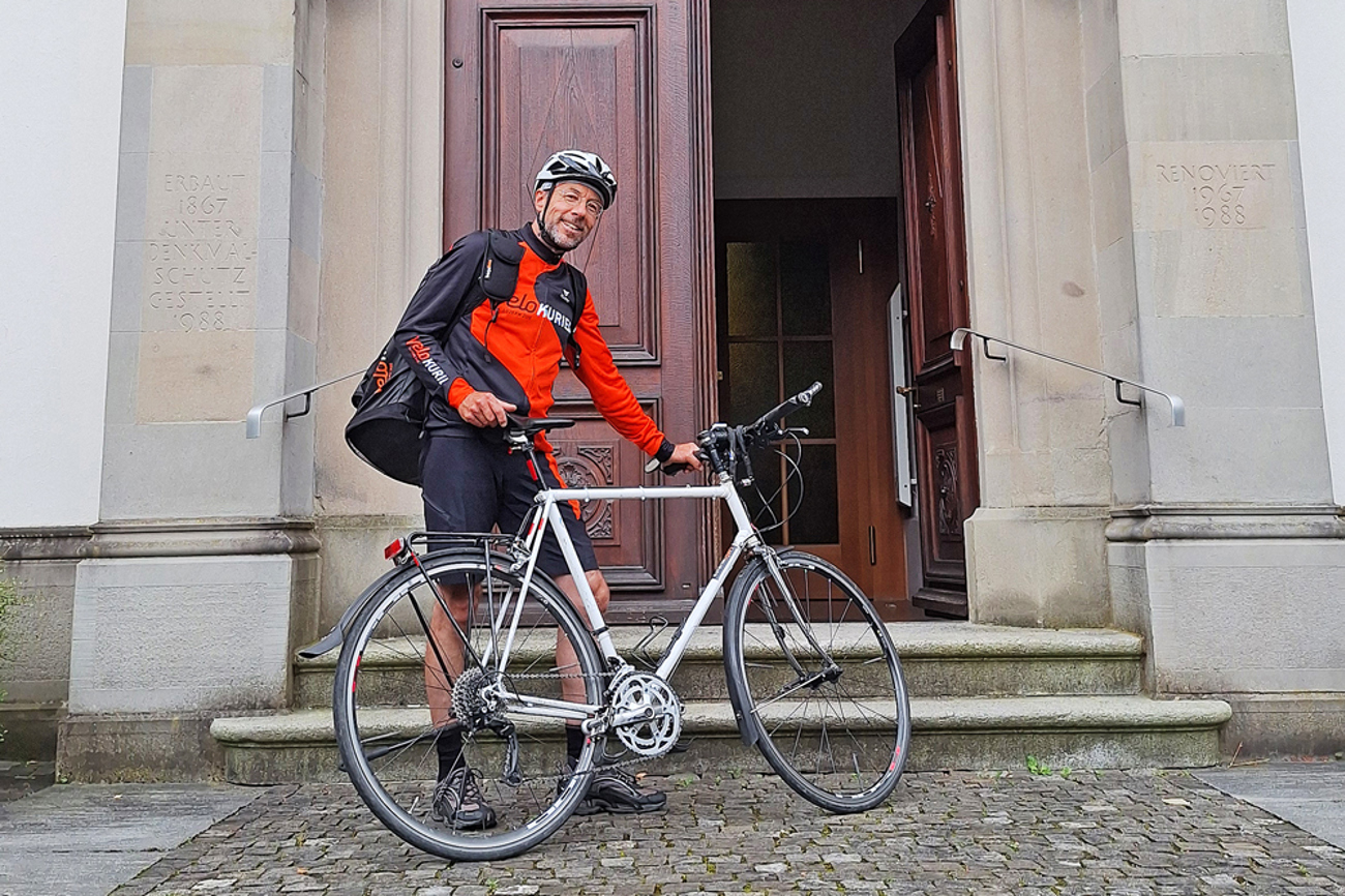 Parallel dazu liegt ihm das Velofahren im Blut: Aus Begeisterung wurde Beruf. Seit fünf Jahren fährt er regelmässig als Velokurier durch den Kanton Zug im 30-Prozent-Pensum. Er liefert Post, Blumen, Medikamente, Laborproben, Mittagessen oder leert die Bücherrückgabebox am Metalli für die Stadtbibliothek. «Ich treffe viele Menschen, die meine Arbeit sehr wertschätzen.» Hinzu kommt ein Minipensum von 10 Prozent als Energieoptimierer für kirchliche Liegenschaften. In dieser Funktion berät er Kirchgemeinden, analysiert Haustechnik und schlägt Massnahmen vor, die den Energieverbrauch um bis zu 25 Prozent senken können, ohne Komfortverluste – ganz im Sinne der kirchlichen Schöpfungsbewahrung.