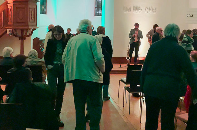 Grosses Interesse: Der erste Jazzgottesdienst in der Dorfkirche Kleinhüningen in Basel war so gut besucht, dass kurz vor Beginn noch etliche Stühle bereitgestellt werden mussten. Pfarrerin Franziska Kuhn lud dazu ein, sich von der scheinbar mühelosen Leichtigkeit der Jazzimprovisation und dem Vertrauen der Musiker untereinander für das eigene Leben und Gottvertrauen inspirieren zu lassen.