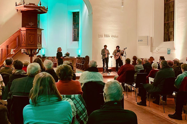 Für die musikalische Leichtigkeit sorgten die Jazzmusiker Tim Hüllstrung und Niels Pasquier mit eindrucksvollen Arrangements. Die nächsten Jazzgottesdienste in der Dorfkirche Kleinhüningen finden am 14. April, 1. September und 10. November statt.