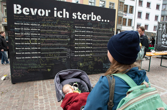Ein schwarzer Kubus auf dem Schaffhauser Fronwagplatz trägt die Wünsche von Passanten, was sie tun wollen, bevor sie sterben. Die Aktion zeigt, wie wichtig es ist, vor dem Tod zu leben.