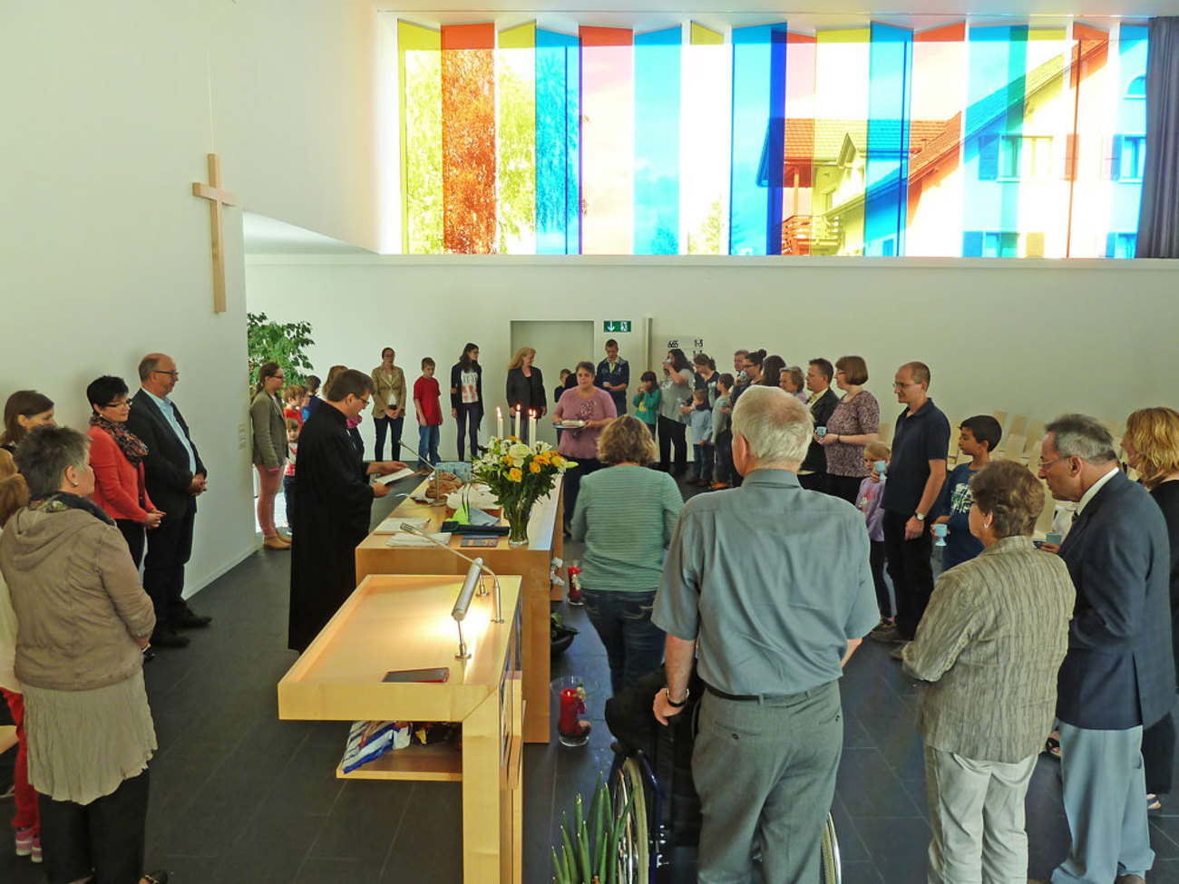 Im Bild die Kirchgemeinde bei einem Abendmahl. Bunte Kirchenfenster und ein schlichtes Interieur mit Kreuz charakterisieren unsere Kirche.